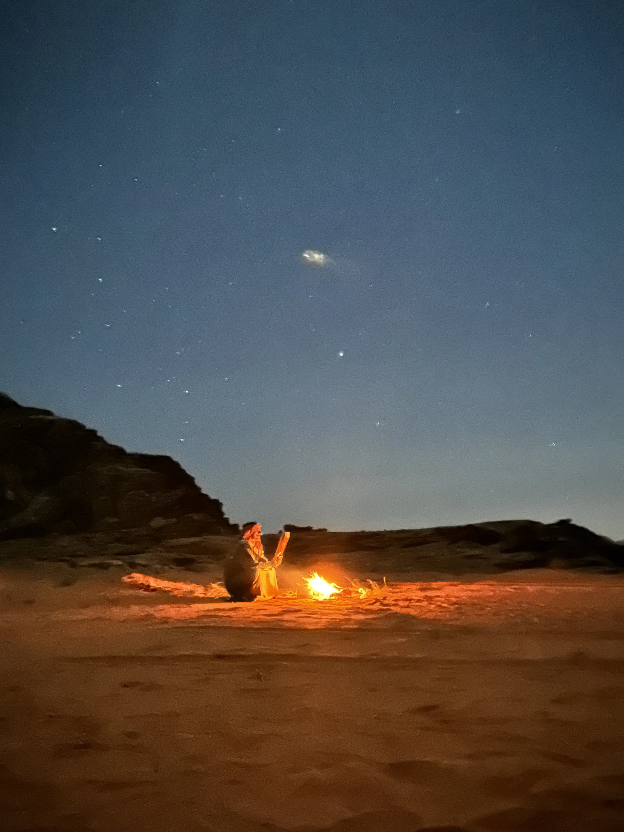 Eens de nacht viel, kregen we van onze gids een korte les sterrenkunde. Hij toonde ons hoe de bedoeïenen al eeuwenlang navigeren aan de hand van de sterren. Zonder lichtvervuiling voelde de sterrenhemel hier bijna tastbaar. Het is verbazingwekkend hoeveel je kunt zien met het blote oog wanneer je ver weg bent van steden en licht.