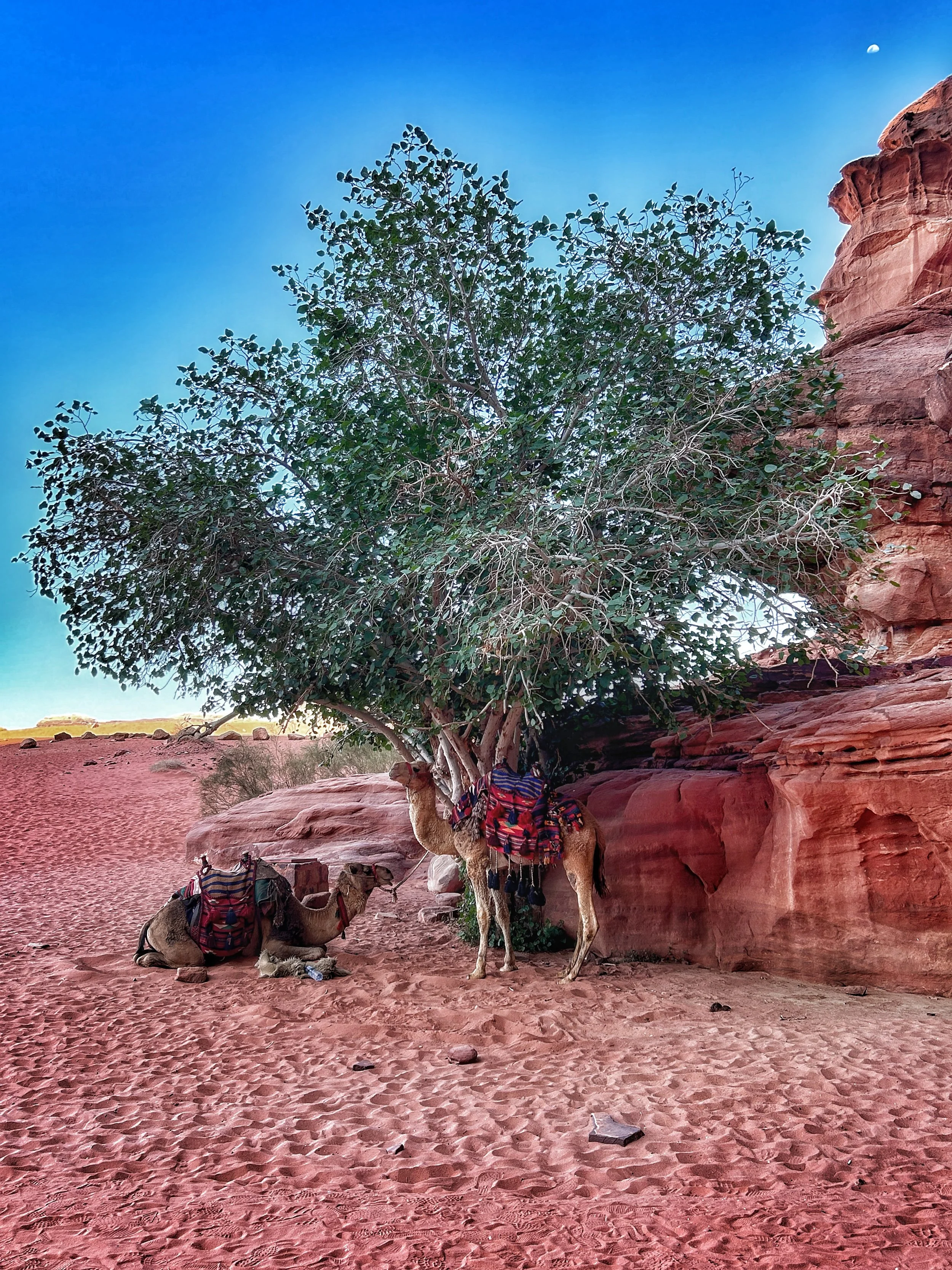 De volgende ochtend stonden er kamelen klaar voor de tocht terug naar de bewoonde wereld. Een rustige rit, schommelend over het zand, met het eerste ochtendlicht dat het landschap goud kleurde. Een moment van pure rust en reflectie.